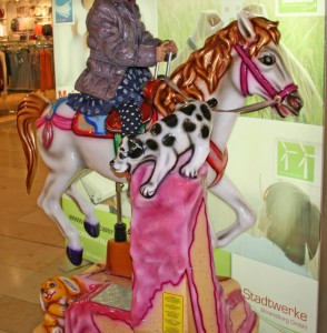 Im CCA gibt es ein Schaukelpferd. Das ist aber nicht kostenlos, sondern: 1 x reiten = 50 Cent, 3 x reiten = 1 Euro. Und ich habe beobachtet, dass viele Kinder traurig davor stehen, weil die Eltern nicht bereit sind, für dieses kurze Vergnügen soviel Geld zu bezahlen. Und wenn die Mama in der Zeit einkaufen will, dann müsste sie mindestens 10 Euro für das Schaukelpferd ausgeben. Außerdem könnte sie ein kleines Kind dabei gar nicht unbeaufsichtigt lassen.