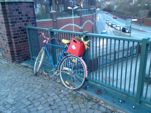 Erst wenn  der Reisende dann wieder zurückkehrt zum Bahnhof und abreisen will, dann liest er eventuell auf der anderen Seite des Rostrades auf einem dort angebrachten Schild, dass es sich hier um einen Wegweiser zum Ahrensburger Schloss handeln soll. Und dann wird dem Gast auch klar, warum er da noch mehr solcher Sperrmüllräder in der Stadt gesehen hat wie zum Beispiel auf der Brücke in der Hagener Allee, wo auf dem Gepäckträger noch der Weihnachtsschmuck aus dem letzten Jahr zu sehen ist mit Goldschleife.