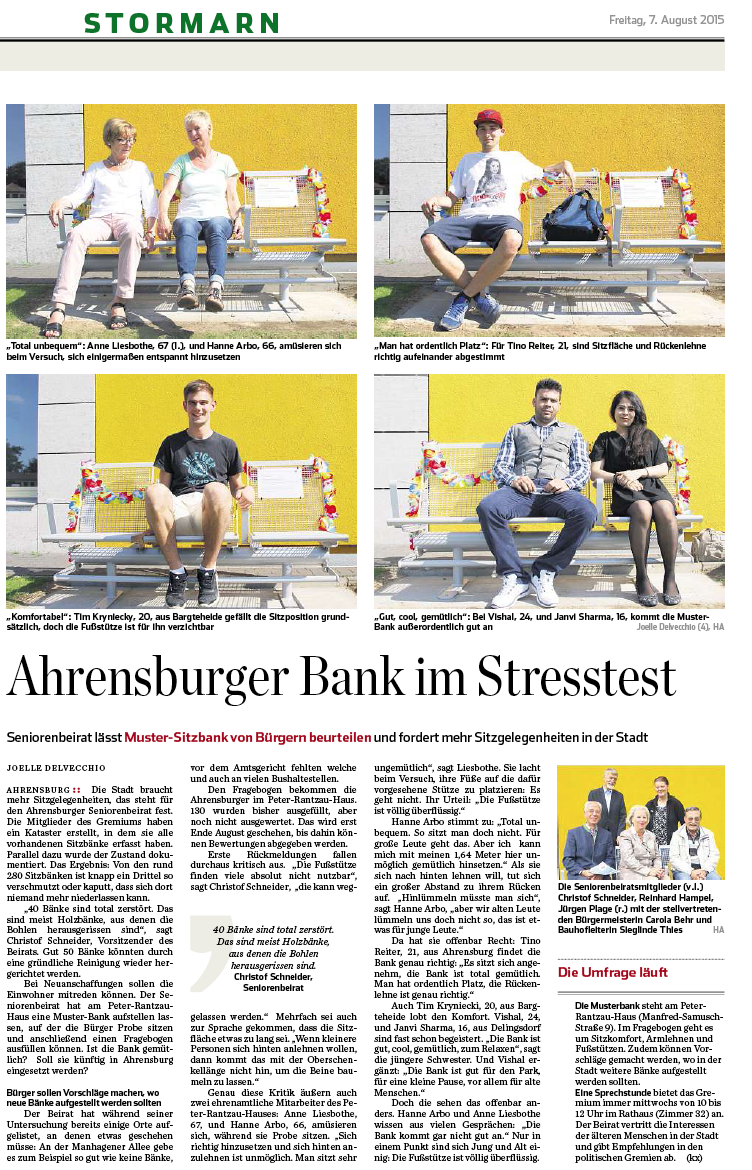 Es ist Ferienzeit und damit auch Zeit der sauren Gurken für die Presse. Zumindest für die Stormarn-Beilage. Und deshalb berichtet das Blatt über den Bank-Test am Peter-Rantzau-Haus, veranstaltet vom Senioren-Beirat und eine Lachnummer des Sommers.