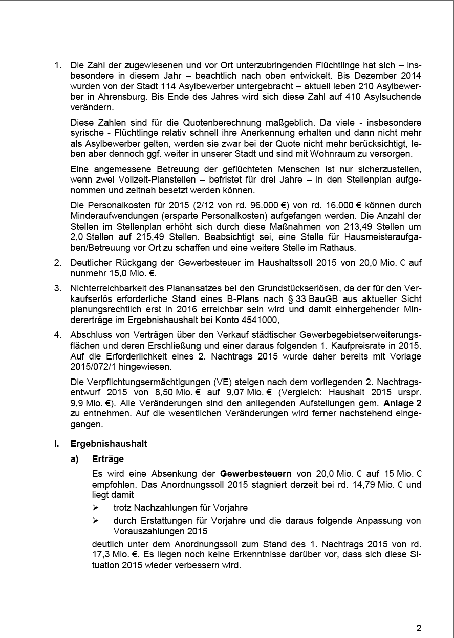 Im Rahmen der Beratung des 2. Nachtragshaushaltes 2015 (Vorlage 2015/121) teilte die Verwaltung in der Finanzausschusssitzung von Montag mit, dass das sogenannte Gewerbesteueranordnungssoll weiterhin nur bei 14,7 Mio. EUR läge (Planung 20 Mio. EUR).