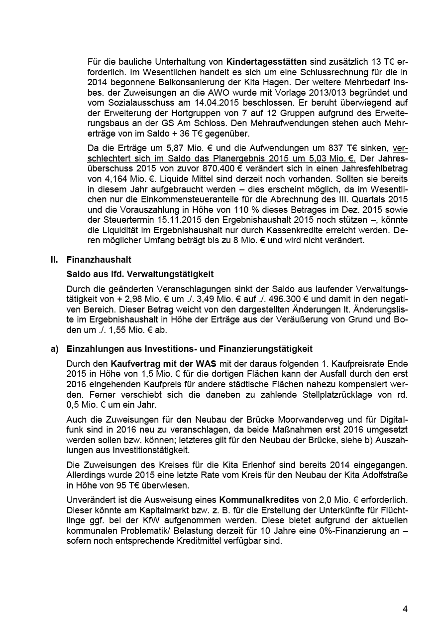 Der Haushaltsentwurf 2016 wurde von der Verwaltung noch nicht vorgelegt. Auf Nachfragen von Ausschussmitgliedern deutete die Verwaltung aber an, dass für das Haushaltsjahr 2016 mit einem „Finanzloch“ von ca. 10.Mio. EUR zu rechnen sei.
