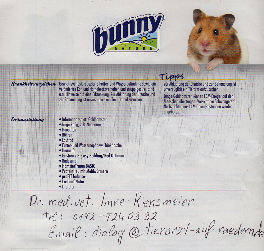 Hierzu mein Erlebnis: Im vergangenen Jahr haben wir für unsere Tochter einen Teddyhamster gekauft, und zwar in Das Futterhaus in Ahrensburg. Und ich hatte den Eindruck, dass man sich dort beim Verkauf von Kleintieren große Mühe gibt und mit Sorgfalt bei der Beratung der Kunden vorgeht. Dazu gehörte auch ein Werbeblatt, auf dem die Verkäuferin den Namen einer Tierärztin auf Rädern handschriftlich vermerkt hat – siehe die Abbildung unten! Und dort sollten wir anrufen, wenn wir gesundheitliche Probleme mit unserem neuen Haustier hätten.