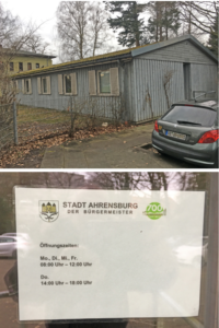 Wir haben in Ahrensburg drei Rathäuser. Falls Sie das nicht wissen, finden Sie hier die näheren Angaben: Rathaus Nr. 1 ist das große, denkmalgeschützte Gebäude in der Manfred-Samusch-Straße. Links daneben steht im Hintergrund das 2. Rathaus, das aus Containern zusammengesetzt ist. Und rechts vom Denkmal hinter dem Parkplatz befindet sich vor dem Bruno-Bröker-Haus das 3. Rathaus – siehe die Abbildungen!
