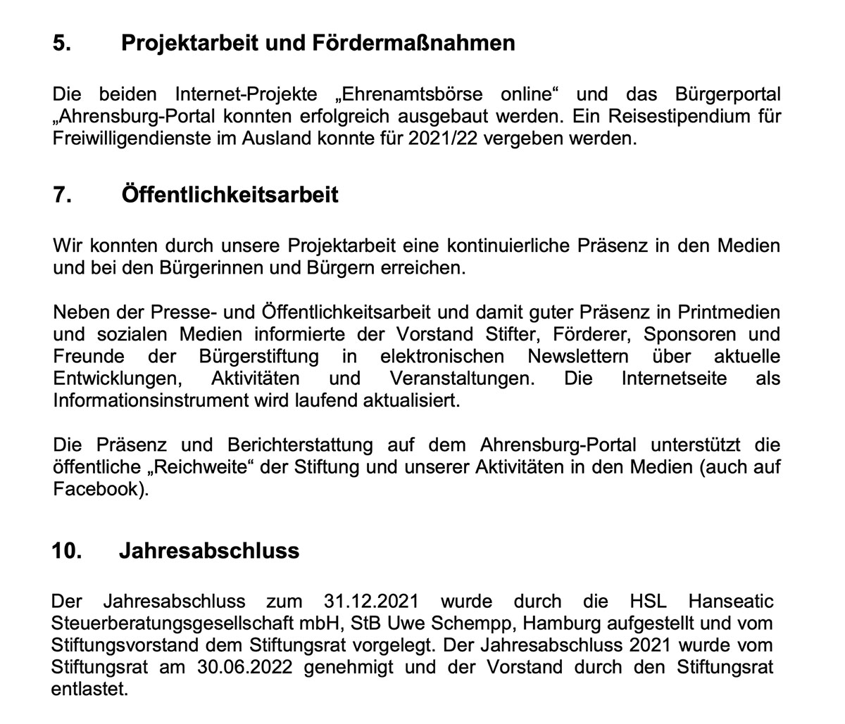 Wenn ich es nicht selber gelesen hätte, dann würde ich es nicht geglaubt haben. Zwar traue ich Dr. Michael Eckstein jede dubiose Aktion zu, aber dass er sich selber damit auch noch damit rühmt, dass er seine Privatfirma mit Stiftungsgeld seiner eigenen BürgerStiftung finanziert – das ist schon der Oberhammer! Und wenn Sie es mir nicht abnehmen wollen, dann schauen Sie auf die Abbildung von der BürgerStiftung Region Ahrensburg!