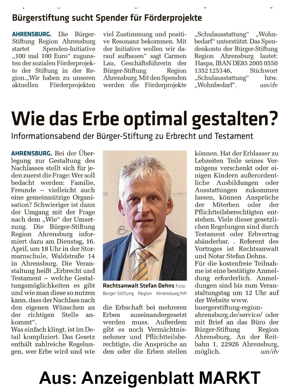 Und warum verspielt das Anzeigenblatt MARKT seine Glaubwürdigkeit bei den Bürgern? Hier sind zwei Corpora Delicti aus der heutigen Ausgabe, die zeigen: Die Redaktion vom MARKT steckt mit der BürgerStiftung Region Ahrensburg unter einer Decke.