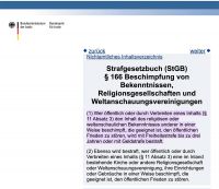 Zum Thema Blasphemie und einer möglichen irdischen Strafe: Wer öffentlich oder durch Verbreiten eines Inhalts (§ 11 Absatz 3) den Inhalt des religiösen oder weltanschaulichen Bekenntnisses anderer in einer Weise beschimpft, die geeignet ist, den öffentlichen Frieden zu stören, wird mit Freiheitsstrafe bis zu drei Jahren oder mit Geldstrafe bestraft.