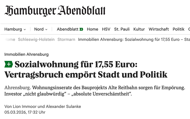 Wenn man der Redaktion glauben darf, dann hat Bürgermeister Eckart Boege erst jetzt begriffen, dass die Stadt vom Investor über beide Ohren gehauen wurde: Weder Kino noch Sozialwohnungen gibt es für Ahrensburger Bürger! Wobei das mit dem Kino schon vor dem Kaufvertrag vorauszusehen war. Und das mit dem Wohnungsbeschiss hätte der Scheffe der Verwaltung bereits im November 2025 auf Szene Ahrensburg erfahren können.