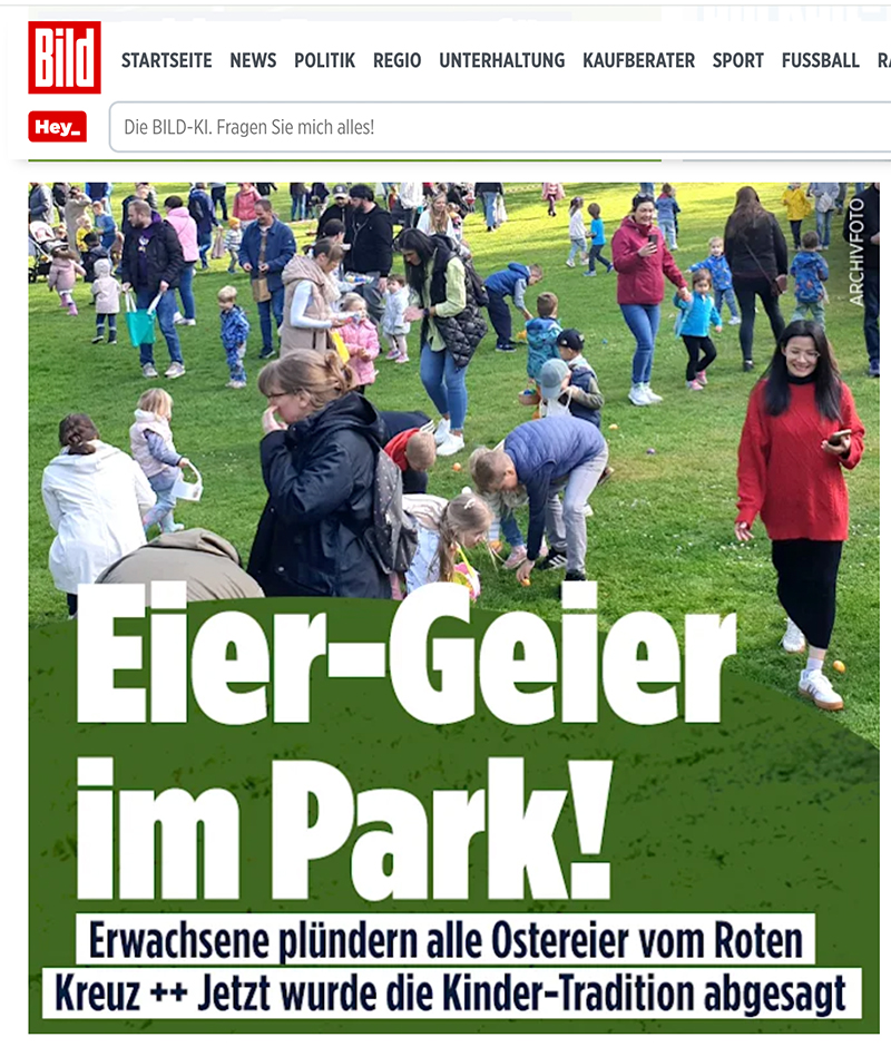 Und noch etwas ist in der „Bagatelle“, der Vereinszeitung des Bürgervereins, zu lesen: In diesem Jahr wird es das traditionelle Ostereiersuchen auf der Schlosswiese leider nicht geben, wozu es zwei nachvollziehbare Begründungen gibt – siehe die Abbildung!