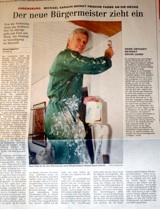 Auf einen neuen Dienstwagen (40.000 Euro sind dafür vorgesehen) will Michael Sarach erst mal verzichten. Und fürs Büro genügt ein neuer Anstrich. Diese Arbeit will der neue Amtsinhaber aber nicht selber machen, sondern von einem Ahrensburger Malerbetrieb ausführen lassen. (So schnell hat Sarach sich meine Kritik zu Herzen genommen, weil er mit seinem Foto in der Stormarn-Beilage gezeigt hatte, dass er für Malerarbeiten in seiner neuen Wohnung keine Ahrensburger Handwerksfirma beauftragt, sondern selbst den Pinsel geschwungen hat.)