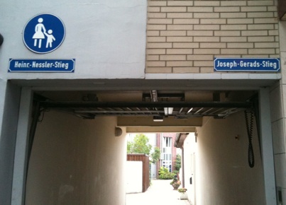 Es ist eigentlich keine Straße, sondern ein Stieg. Mitten in Ahrensburg, Hamburger Straße, links neben meinem Lieblings-Café Gerads. Und dieser Stieg trägt zwei Namen: „Heinr.-Nessler-Stieg“ auf der einen und „Joseph-Gerads-Stieg“ auf der anderen Seite.