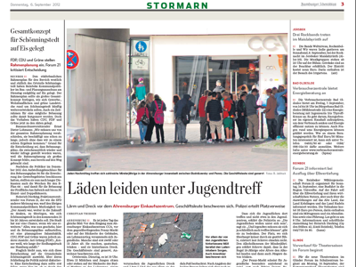 Heute berichtet die Stormarn-Beilage darüber, dass sich die Jugendlichen unserer Stadt tagtäglich in der Rampengasse treffen, um dort in Gesellschaft zu trinken, zu rauchen und zu quatschen. Und sie hinterlassen dort sehr viel Müll, über den sich CCA-Hausmeister City-Center-Manager Erich Lawrentz beschwert, der dort als Sozialpädagoge und Saubermann einen Sisyphos-Job verrichten muss.