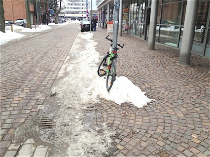 Und es wird erkennbar: Auf der Straße wurde der Schnee beseitigt. Und auf dem Gehweg für Nicht-Behindert ebenfalls. Und auf dem Gehweg für Behindete? Dort wurde der Schnee hingeschafft. Denn der Gehweg für Behinderte ist gleichzeitig der Regenwasserablauf für die Straße. Und ein kostenloser Parkplatz überdies.