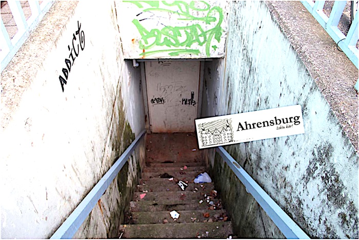 Leere Parkplätze unterm Rathausplatz. Und für die private Zufahrt auf öffentlichem Grund und Boden wurde die Straße zweckentfremdet! Foto unten: Der Flucht-Weg aus der Garage auf dem Rathausplatz der sogenannten „schönen Nachbarin“ von Hamburg, die sich doch tatsächlich um die Landesgartenschau bewerben wollte...